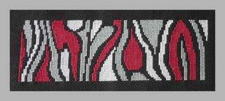 Aujourd’hui, c’est sur une toile aïda noire que j’ai travaillé. Un rouge et deux gris se mélangent pour donner une broderie très moderne. Le format aussi renforce l’aspect contemporain.