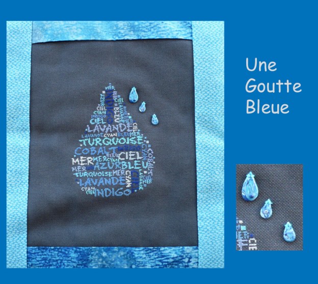 Je crois que l’on peut dire que nous avons un été pluvieux 😦 … alors je brode dans l’air du temps .. Voici aujourd’hui une goutte … avec un dégradé de mots qui ont un lien avec la couleur bleue … Ce modèle est dans le même esprit que mon cœur que vous avez bien aimé 😉