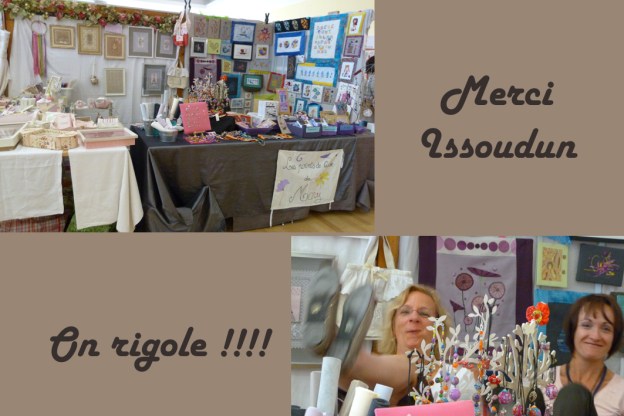 Je tiens à remercier tout le monde, un salon très sympathique … je vous montre mon stand que je partageais avec Véronique Maillard. Et au moment ou j’ai pris la photo mon amie Steph ( venue m’aider 🙂 ) et Véronique n’ont rien trouvé de mieux que de montrer leur pied !!!! C’est du Joli tout ça … comme vous pouvez le voir on ne s’est pas du tout ennuyées !!!!