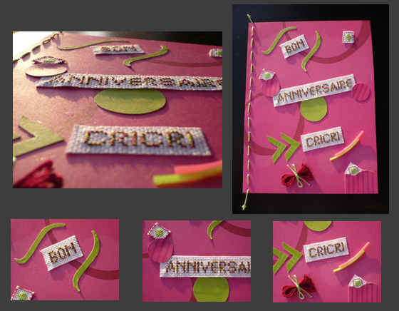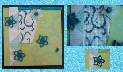 Du ruban en velours, des fleurs en feutrines un peu de toile aïda, des fils de deux turquoises différents et des papiers de chez Sultane et voici une carte: