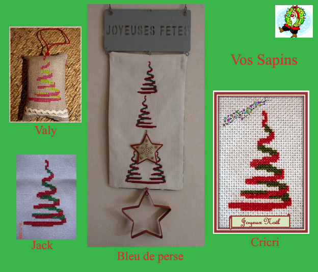 La première, la plus rapide Jack, son blog, a brodé le sapin sur du lin blanc à paillettes … cela lui donne un petit air de fêtes ….