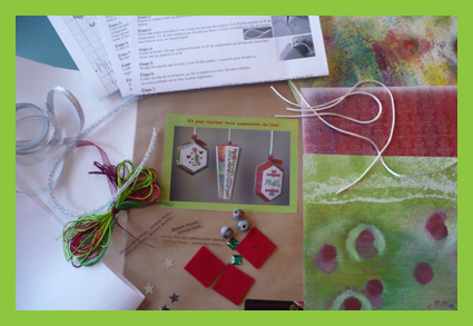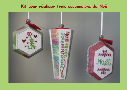 Un kit pour réaliser 3 suspensions de Noël, au début je voulais les appeler les boules de Noël mais elles n’ont rien d’une boule …. 😉