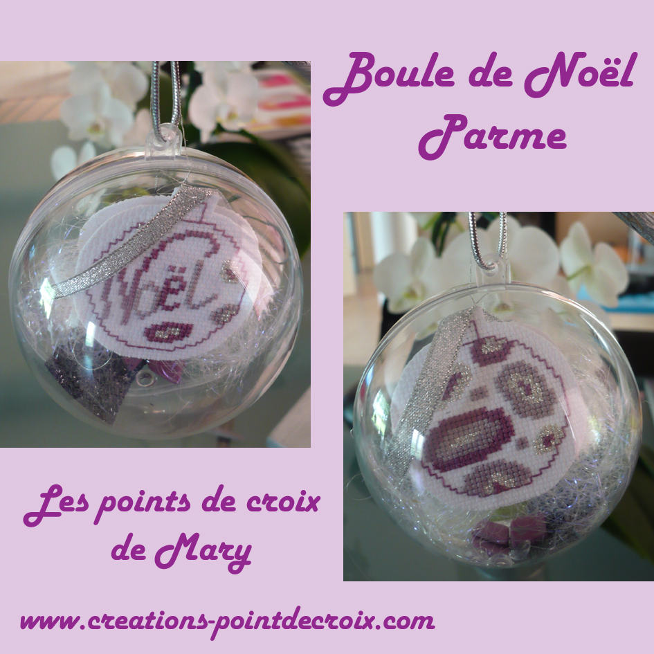 🙂 une boule parme et argentée, j’ai rajouté des cheveux d’anges, des perles des rubans ….