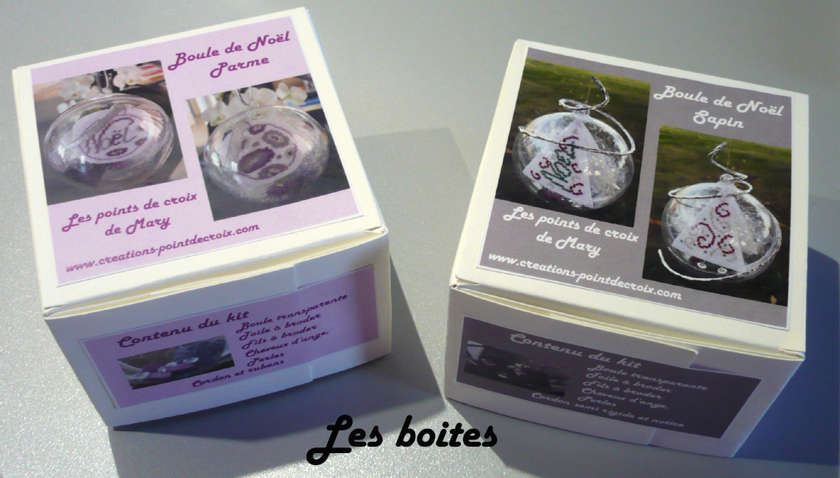 Je vous les propose chacune en Kit, tout est fourni la boule transparente, les rubans, les perles, la toile à broder, les fils, la notice de montage…. chaque kit est présenté dans une petite boite … 😉